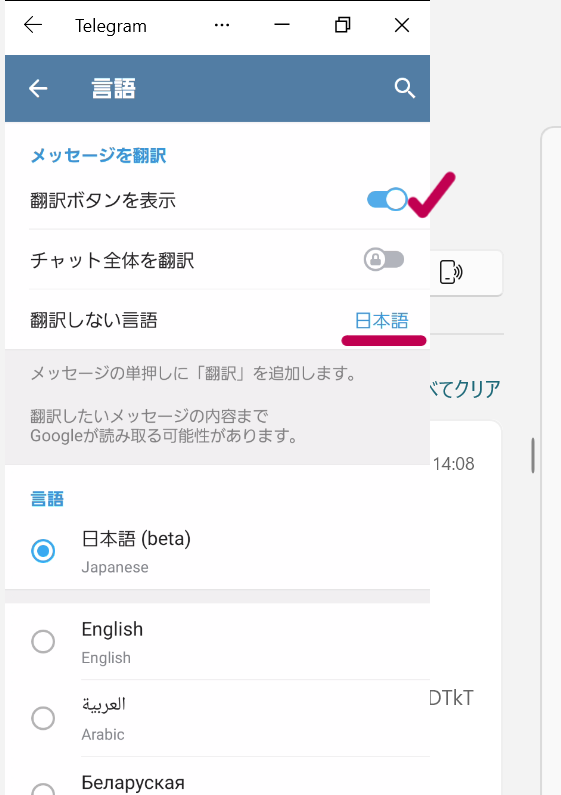 翻訳ボタンを表示の項目をオンにして「翻訳しない言語」の項目が表示されれば完了です