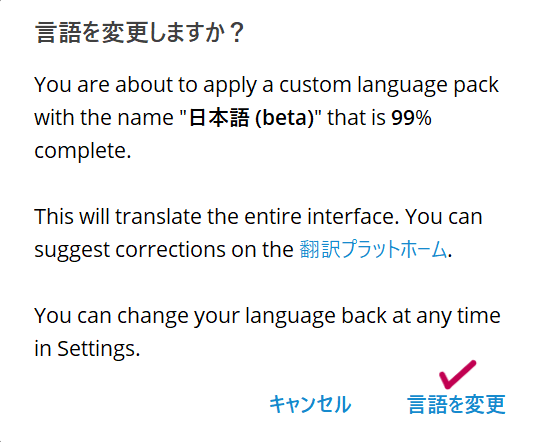 日本語を有効化するサイトへ行くと、日本語に変更するか聞かれるので「Change(言語を変更)」を押して同意します