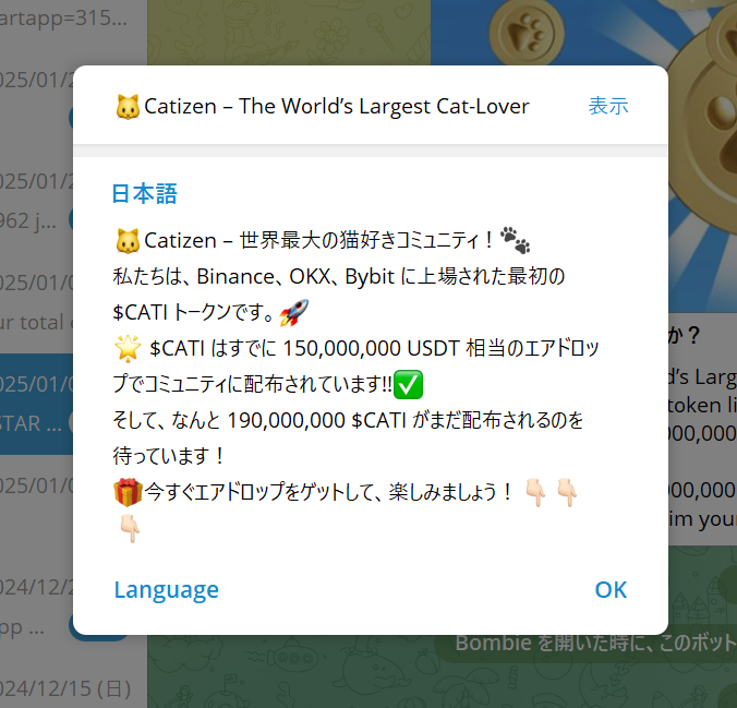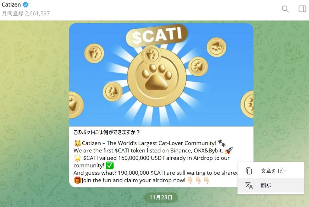 テレグラムゲーム内で送られてくるメッセージは外国語(英語)です。PC版はメッセージを翻訳できますが、スマートホンではiPhone版のみ通訳できるようです。