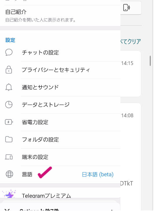 初期状態のテレグラムは英語で表示されているので、日本語表示に切り替えます